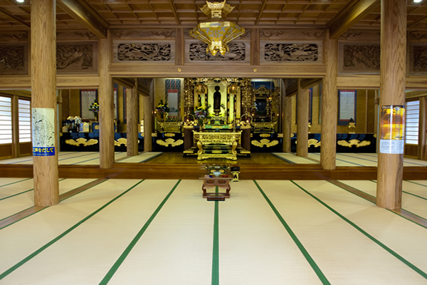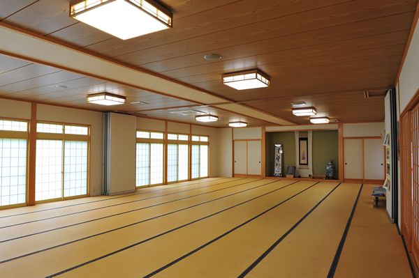 広さ72畳の客殿。空調・音響・厨房を備え、テーブルや座布団などもあるので、御法事等のお斎や各種行事に幅広く使われています。