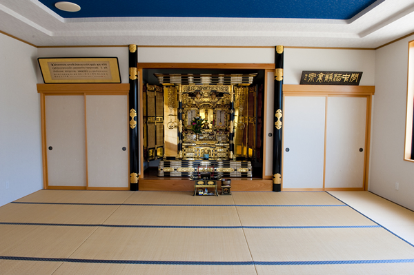 明るい本堂内部。ここで様々な仏事・行事が行われます。自然の光も沢山入り、音響設備も備えております。